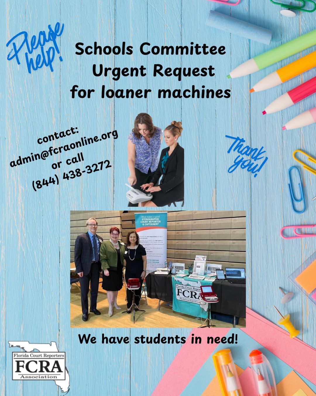 What is Realtime Court Reporting? Court reporters are highly trained professionals who share a unique ability to convert the spoken word into information that can be read, searched and archived. This specialization has created new career paths for reporters, including broadcast captioning and realtime translation services for people who are deaf and hard of hearing. Become a Court ReporterConnect with us on social!"Advancing. Advocating. Educating."The Florida Court Reporters Association (FCRA), a non-profit corporation, exists to advance and perfect the science and art of shorthand verbatim reporting in all its facets, phases, and aspects; and also to foster and maintain the honor and integrity of the court reporting profession while actively serving the public and judicial system of the State of Florida. CLICK HERE TO LEARN MORE